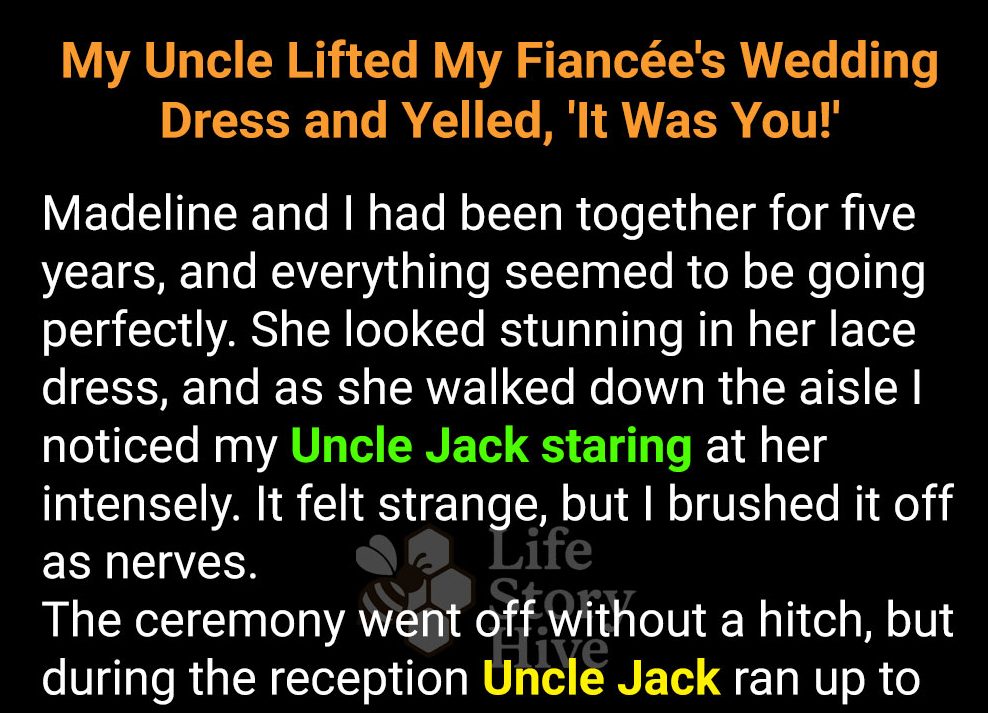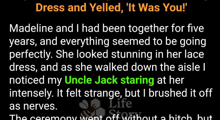 My wedding was perfect — until Uncle Jack sprinted toward us, lifted Madeline’s dress in front of everyone, and shouted, “It was you!” My new wife stood frozen in shock as our guests gasped. What secret had my uncle uncovered, and why was he so fixated on Madeline?