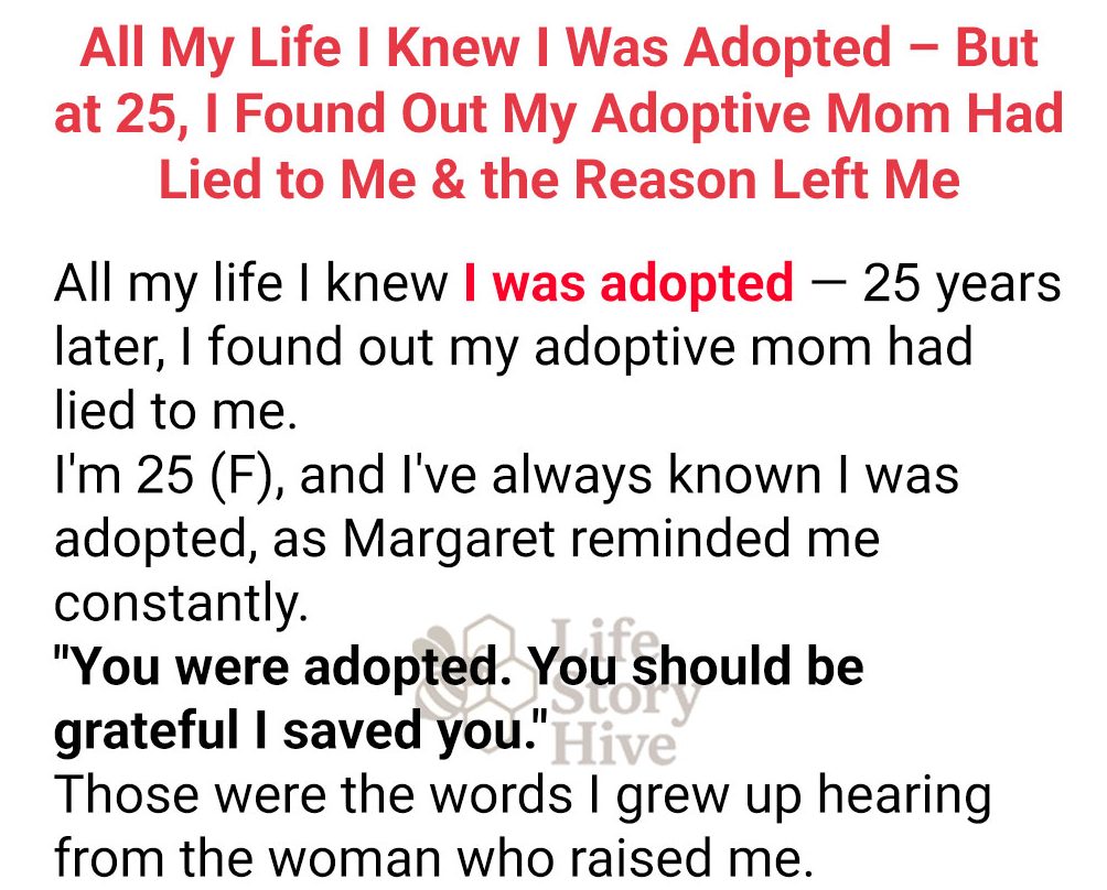 “Why did you tell me I was adopted?” I asked finally. My voice was barely audible, but she heard it. “Why did you lie to me?”
