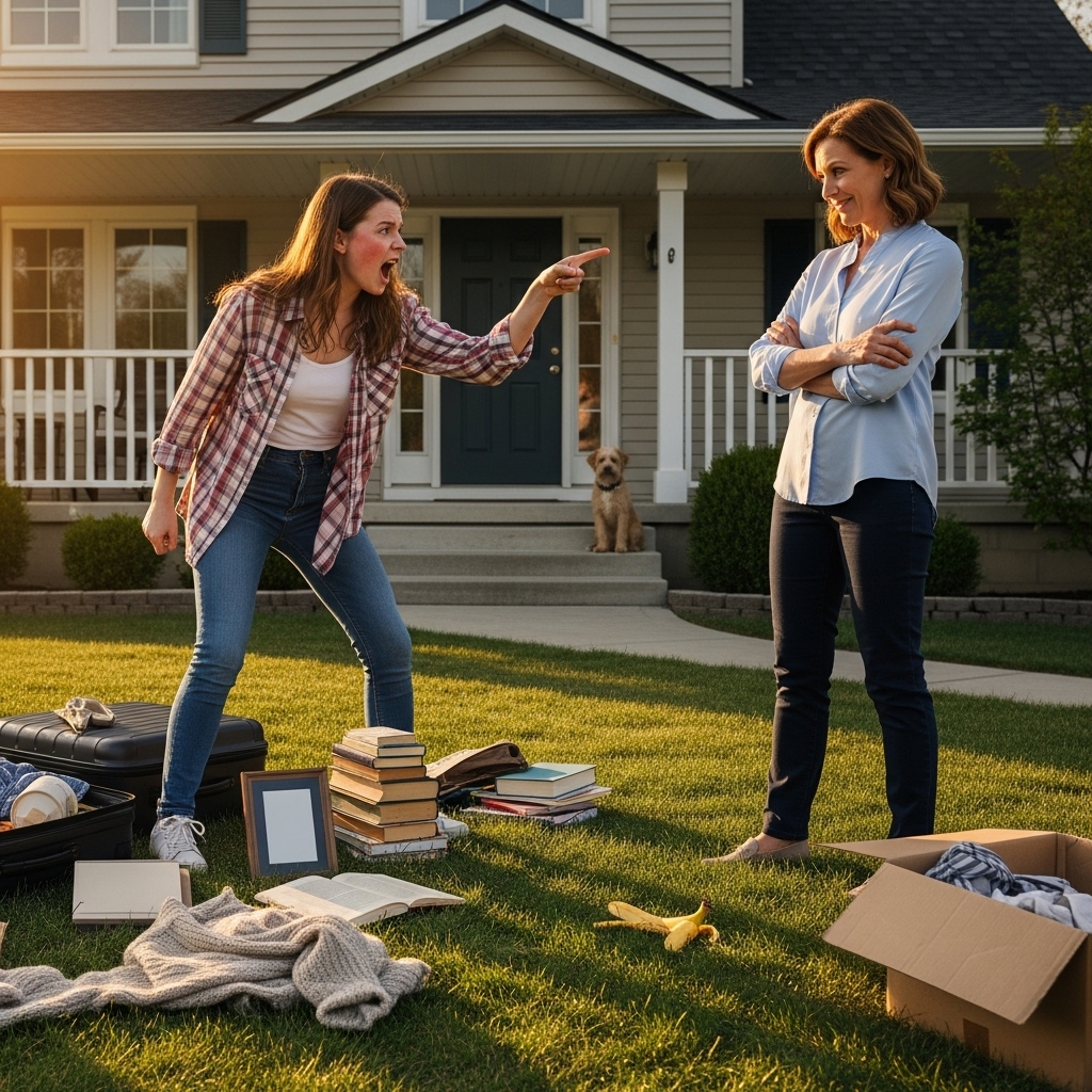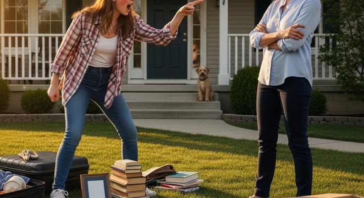 “Clear your stuff off MY lawn, before I call the cops!” After my father passed, my DIL threw all my family belongings out on the lawn, claiming she’d inherited the house! Minutes later, my son pulled up, and karma hit her hard.