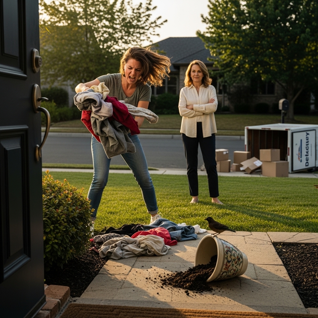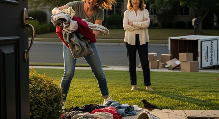 “Clear your stuff off MY lawn, before I call the cops!” After my father passed, my DIL threw all my family belongings out on the lawn, claiming she’d inherited the house! Minutes later, my son pulled up, and karma hit her hard.