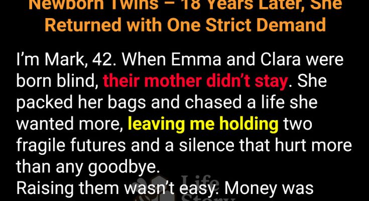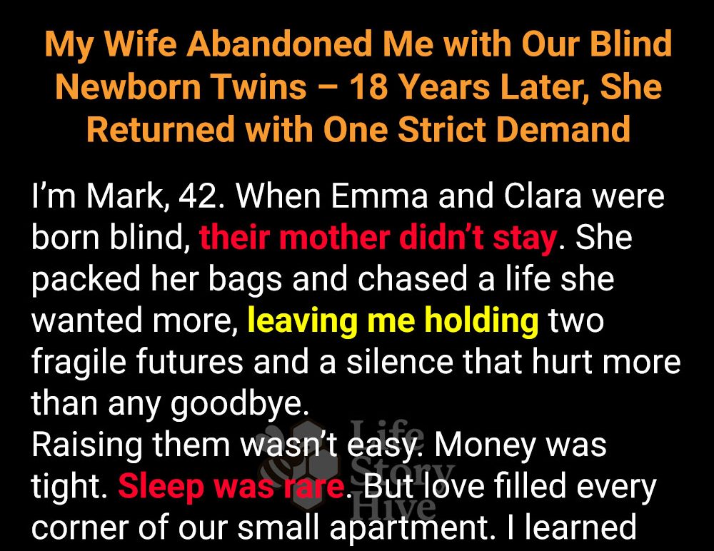 Eighteen years ago, my wife walked out on me and our blind newborn twins to chase fame. I raised them alone, teaching them to sew and building a life from scraps. Last week, she returned with designer gowns, cash, and one cruel condition that made my blood boil.