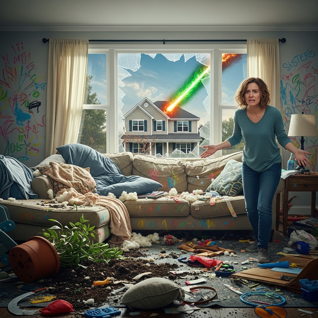Broken glass first. Toys into trash bags. Stain remover on cushions — again and again. She scrubbed the kitchen tiles until her arms ached.