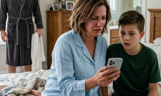 ‘The phone vibrated twice against the kitchen counter, a sharp, insect-like buzz that sliced through the usual hum of a Tuesday evening in Columbus, Ohio. Emily Parker stood at the sink rinsing dishes while her husband, Daniel, showered upstairs after arriving home late. Their thirteen-year-old son, Noah, sat nearby working through algebra problems, one earbud in, half-absorbed in music.